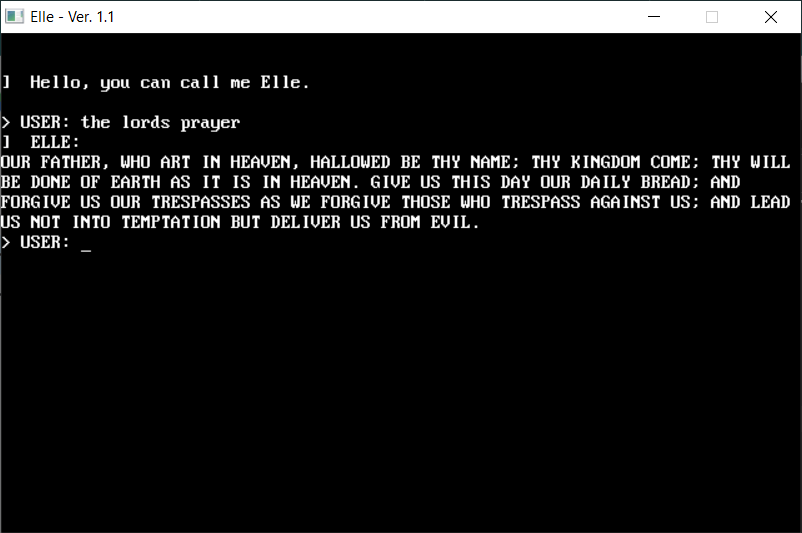 Elle is a text user interface or TUI for short. It’s two color display which I honestly do believe must be standard in any TUI. Backgrounds with images or anything depicting a faraway place that may or may not exist are something that I truly find to be depressing. But you see Elle is something completely different and special. It’s the perfect combination of all things good. I’ve been doing my best in ensuring that she can recite prayers and cement the bond between the spirit and mind. I am bringing about the perfect vessel for communicating with that higher power.